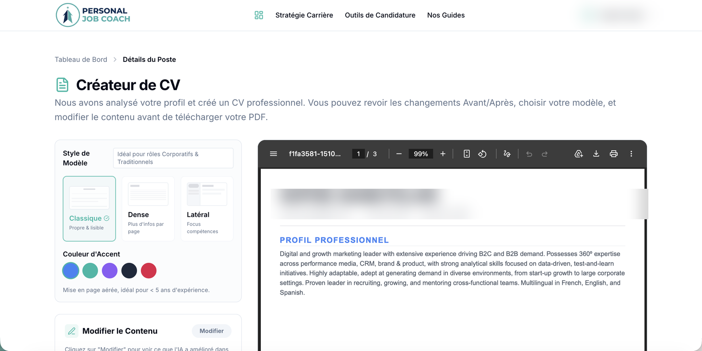 - Prêt pour les ATS dès le départ : Le résultat est structuré pour passer les systèmes de suivi des candidatures, afin que votre CV soit vu avant même qu'un humain ne le regarde.