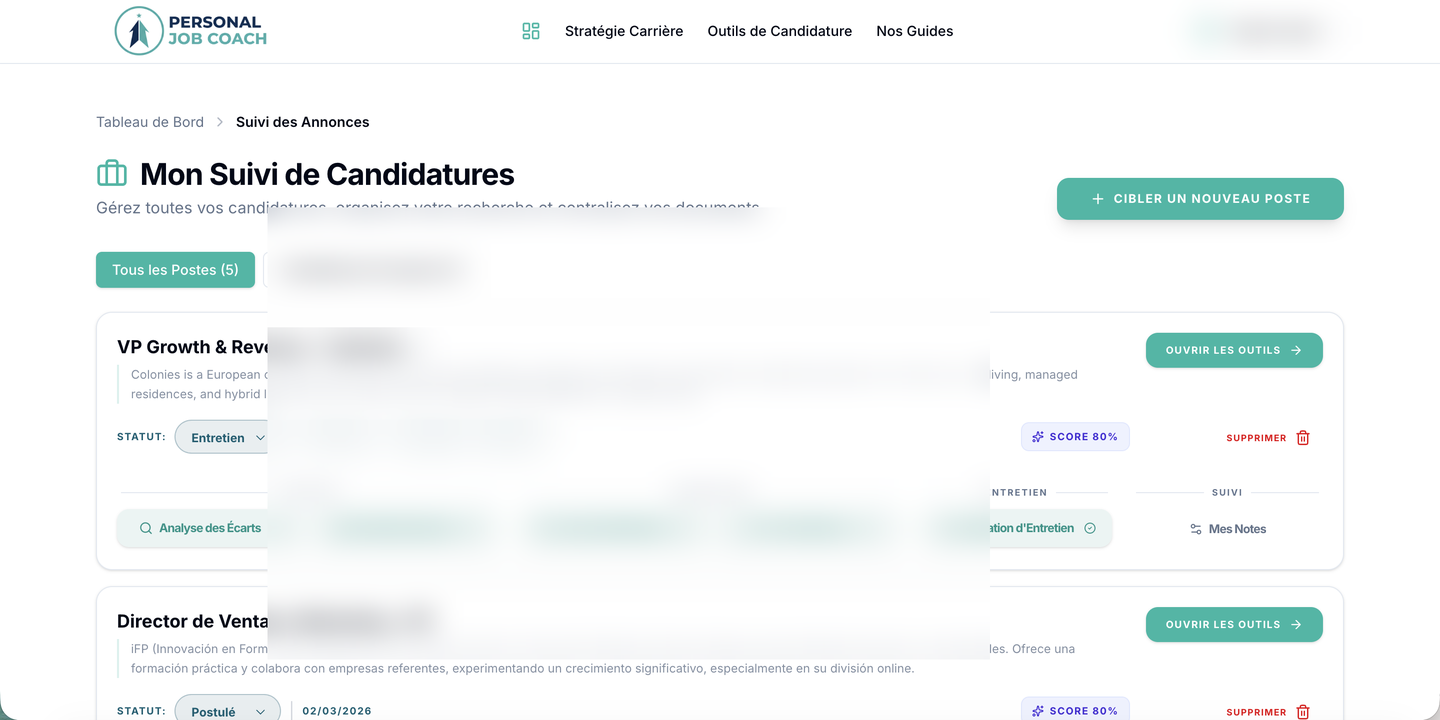 Chaque poste suivi devient un espace de travail. Analyse des écarts, lettre de motivation, CV sur mesure, briefing d'entreprise et préparation d'entretien sont à portée de clic.